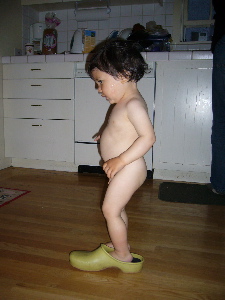 You look like you are rally speeding around the kitchen in those shoes!….and you look very handsome in them too—Who needs clothes?!