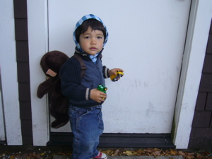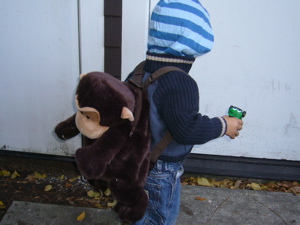Luca loves to put his favorite toys in his new monkey backpack from Gugu (Xiao Jing) and go to kai’s house. Though usually about halfway there, he says, “Too big, Mama bao (carry).”
